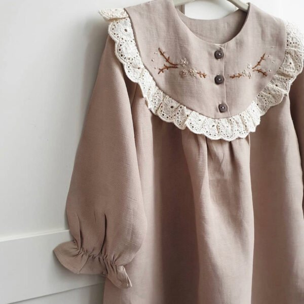 Ein süsses Baumwollkleid mit Handstickerei, Holzknöpfen und Volant.